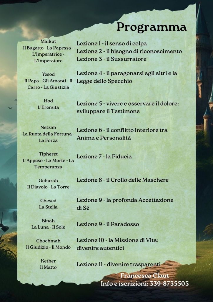 Percorso di 11 incontri basato sulla simbologia dei Tarocchi di Marsiglia e dell’Albero della Vita per sviluppare una consapevolezza profonda e aprirsi alla meraviglia della Vita.
