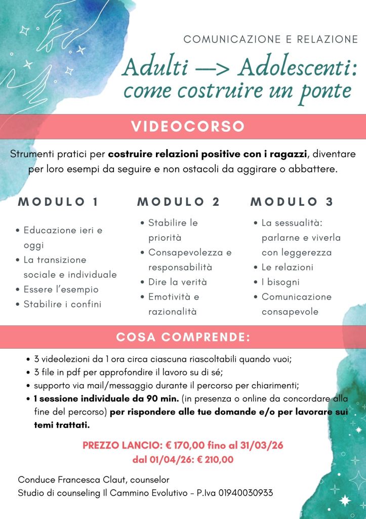 Percorso pensato per genitori e insegnanti che sentono la necessità di acquisire strumenti per costruire relazioni sane con le nuove, meravigliosamente complesse, generazioni.
